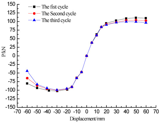The three cycles of the skeleton curve of each amplitude of the specimen L-CFST2 are plotted in Figure 10, which illustrates that the second cycle and the third cycle skeleton curves are almost coincident with the first one of the specimen at the initial stage of loading, and the stiffness of the specimen does not significantly degrade. When the specimen yields, the stiffness degradation of the specimen worsens with the displacement, however, not very obviously. The reason for this phenomenon lies in the restraining effect of the steel tube on the concrete core, which leads to the increased loading capacity and the improved plastic and toughness properties. The presence of concrete delays or avoids local buckling of the steel tube, enhancing the stability of the L-CFST column.