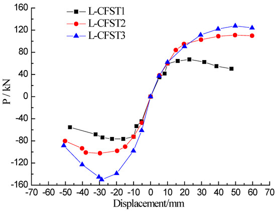 The skeleton curves of the three specimens are shown in Figure 11. The trend of the skeleton curves of the three specimens is basically the same. Analyzing the skeleton curves of the three specimens reveals that the slope of the load-displacement curve changes only slightly during the initial stage of loading, and the loading curves basically coincide with the unloading curves of the specimen. At this stage, the specimen is in the elasticity stage. As the loading continues, the slope of the skeleton curve gradually increases, and the specimen enters the yielding stage. The specimen L-CFST1 yielded firstly, subsequently, the specimens L-CFST2 and L-CFST3 yielded. The peak displacement of L-CFST1 was the smallest and this specimen was the first to experience total damages. It shows that the increase of the wall thickness of the steel tube can effectively increase the ultimate bearing capacity of the specimen, and the constraint of the steel tube on the internal concrete will also be effectively improved.