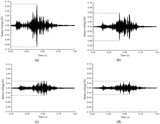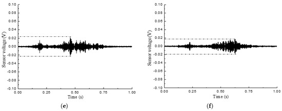 SA4 output voltage signal of L-CFST2. (a) SA4 output voltage signal in the healthy state; (b) SA4 output voltage signal under 5 mm; (c) SA4 output voltage signal under 10 mm; (d) SA4 output voltage signal under 15 mm; (e) SA4 output voltage signal under 20 mm; (f) SA4 output voltage signal under 30 mm.
