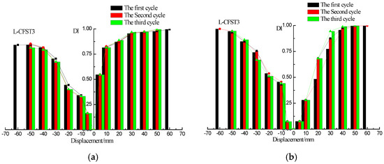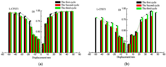 DIs vs. displacement of L-CFST3. (a) DI vs. positive and negative peak displacements; (b) DI vs. zero displacement.