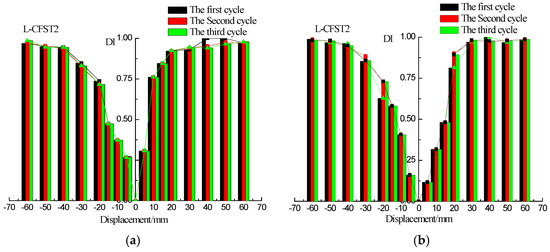 DIs vs. displacement for L-CFST2. (a) DI vs. positive and negative peak displacements; (b) DI vs. zero displacement.