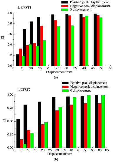 Damage index (DI) vs. displacement for L-CFST1. (a) DI vs. positive and negative peak displacements; (b) DI vs. zero displacement.