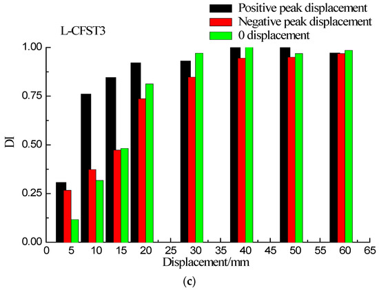 The first cycle damage index graphs of the three test specimens are shown in Figure 16a–c, respectively, for the different displacements (positive peak displacement, negative peak displacement, and zero displacement). Because of the asymmetry of the L-CFST specimen, the concrete in area I (Figure 6) is under tension in the positive peak displacement during the test. Under the negative peak displacement, the concrete in area I is compressed, and the concrete in area II is tensioned. Please notice that the concrete in area II is far from the monitoring position. Therefore, in Figure 16, the value of the damage index at the positive peak displacement is greater than that of the negative peak displacement, and the value of zero displacement damage index is basically between positive and negative peak displacement damage index values, which indicates that the cracking degree of the concrete at the monitoring location is the most serious during the positive peak displacement. This phenomenon reflects the repeated opening and closing of concrete cracks in the core area during the low-frequency cyclic loadings.