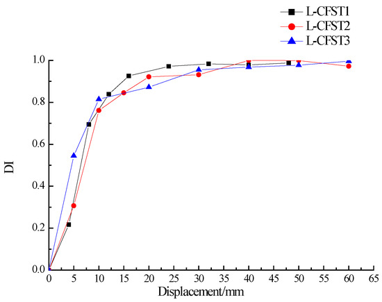 DI vs. displacement of all specimens. (a) L-CFST1; (b) L-CFST2; (c) L-CFST3.