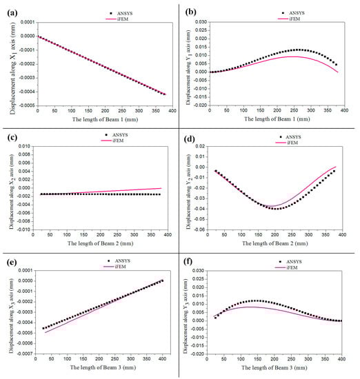 Figure 10a–f show the comparison result of the membrane and bending displacement in beams 1–3, respectively. The continuous curves indicate the deformation reconstructed by iFEM while the discrete points are the deformation computed by ANSYS in the figures. They show that the deformation of the gantry structure obtained by iFEM coincides with that computed by ANSYS. It certifies that iFEM for reconstruction of deformation in the gantry structure of heavy-duty machine tools is accurate.