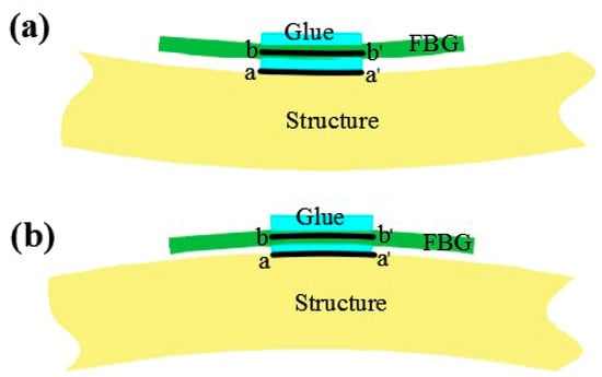 The glue, the black tape and FBG position errors are additional factors which lead to reconstruction error. As the glue and the black tape cannot completely fix the FBG to the surface of the measured structure, there is an error between the strain measured by the FBG and the actual strain. As for FBG position errors, as shown in Figure 11a, when the structure is pressed, due to the thickness of the glue, the measuring position of the FBG is the cross section, while the actual deformation position of the structure is the cross section. The relation of strain data between the two positions can be expressed as follows:
