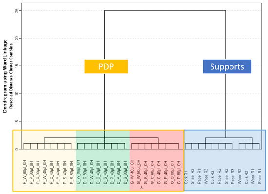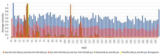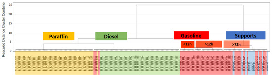 A hierarchical cluster analysis (HCA) was carried out with samples that had not suffered weathering for gasoline, diesel, and paraffin on four supports when using different volumes (40 μL and 80 μL). Supports without PDPs were also included, so a total of 60 samples were used for this analysis. Samples were normalized to the maximum and Ward’s method with Euclidian distance was used in the HCA. Average values of the intensities for replicas were used for a better visualization. The results are graphically displayed in the dendrogram shown in Figure 1. As reported previously [41], a full classification of the samples according to the presence/absence of the liquids was obtained, in addition, the support and the type of PDPs were also obtained. In addition, it was shown that when the samples were not weathered there was no influence on the volume used in this classification analysis.