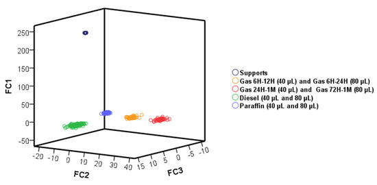 So, samples of gasoline, diesel, and paraffin that had not suffered a weathering process (0 h) in four supports were analyzed with the aim of demonstrating the capacity of the eNose to differentiate neat hydrocarbons on different supporting materials even when different volumes are used.