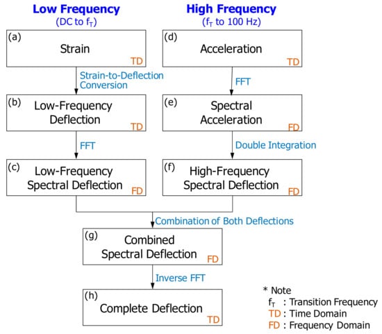 Illustration of the PDM applied to a passenger train: (a) Measure strain history, (b) Strain spectrum from FFT, (c) Measures acceleration history, (d) Acceleration spectrum from FFT, (e) Deflection spectrum from double integration of acceleration, (f) Combined deflection spectrum, and (d) Deflection history from inverse FFT of combined deflection spectrum.