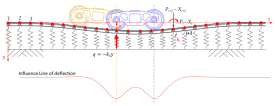 Firstly, the transient load applied by a train bogie to a sleeper is investigated, as shown in Figure 2. The ballast is modeled with a series of springs, which deform in proportion to the individual load delivered by a bogie. This spring-based model of a geotechnical material is called Winkler foundation (Equation (3)), and its solution was released in 1867 []. The basic differential equation for the Winkler model is expressed as Equation (3), where y is vertical displacement of a rail, is contact pressure and is the subgrade reaction coefficient.