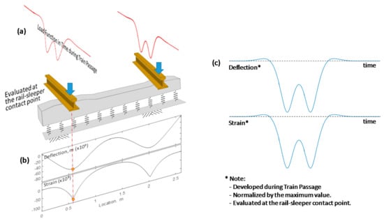 The discussion in this section is based on the fundamental assumption that ballast has a uniform stiffness. With a different ballast condition like a hanging sleeper, the results may not be simplified like those in this section. In a typical situation, however, the deflection of a concrete sleeper has the same shape as the strain measured at the top surface of a concrete sleeper, as shown in Figure 3c. Therefore, the strain-to-deflection conversion in the case of a concrete sleeper does not require any particular formula, and it is rational to take a strain history as a deflection history for the PDM.