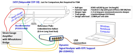 Conventionally, practitioners in Korea have used a linear variable differential transformer (LVDT) or a potentiometer to carry out the deflection measurement of a sleeper. The apparatus was mounted on a short steel rod driven into ballast in the vicinity of a track. The sleeper deflections measured by LVDT’s or potentiometers tend to be underestimated due to movement of a mounting rod induced by train loading. Particle velocities of a sleeper, measured by 1- or 2-Hz geophones, have also been introduced to evaluate deflections through numerical integration. Deficit frequency components (typically 0–7 Hz) in the geophone-based signals lead to modification of the signals by low-pass and high-pass filters [,]. Even after filtering, the resulting deflections tend to be upwardly shifted, therefore using peak-to-peak deflections rather than just maximum deflections is recommended [,]. Recently, however, some successful techniques [,,,] have been reported to reproduce deflections reliably from accelerations or velocities of railroad tracks, ground surface, and other structural members. Other effective approaches of measuring sleeper deflections include piecewise integration of an acceleration history [], and an LVDT mounted on the settlement pegs embedded into ballasts [].