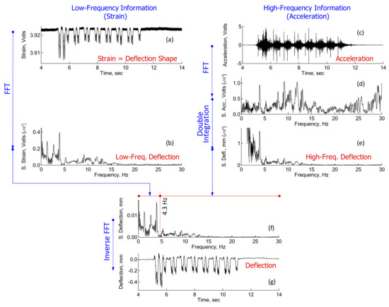 where and are spectral deflection and acceleration in an exponential form, is acceleration at the circular frequency of , and is time. The problem in the integration arises because most accelerometers are not sensitive to low frequency vibrations (e.g., vibrations lower than 3–4 Hz in the case of a PCB 353B68 accelerometer). Therefore, acceleration information over these frequencies (0 to 3–4 Hz) is not available in the data measured by accelerometers. As a result, the integration based on Equation (2) produces a strange deflection shape due to the lack of low-frequency information.