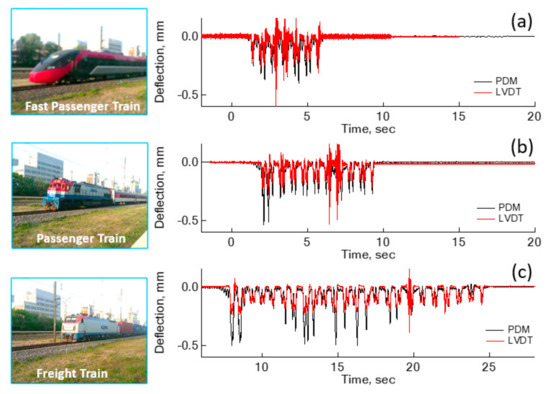 Further examples of deflections evaluated by the PDM, compared with linear variable differential transformer (LVDT) deflections: (a) ITX-Saemaeul Train, (b) Moogunghwa Train, and (c) Freight Train.