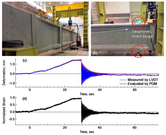 A more intensive laboratory test was made on the reliability and accuracy of the PDM for estimation of deflections. In the laboratory test (Figure 7a), a concrete beam was used due to low-frequency behavior and availability of the model. In the test, a pair of geophones and a strain gauge were installed at the top surface of a concrete beam, shown in Figure 7b. The aim of the test was to investigate the structural characteristics of free vibration, where accelerations and deflections of the beam were measured directly by an LVDT installed at the bottom of the same beam and indirectly by the PDM. The PDM deflections were compared with the LVDT deflections. In this PDM test, a 2.0 Hz geophone was used instead of an accelerometer, to enable better sensitivity for low frequency measurements.