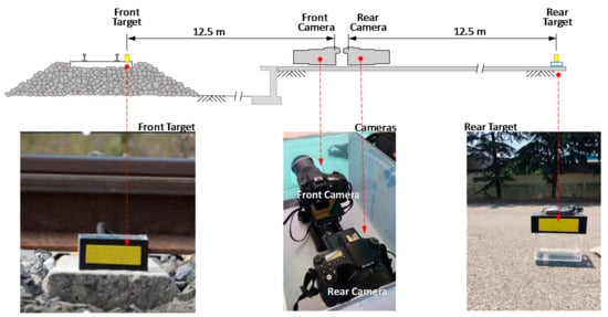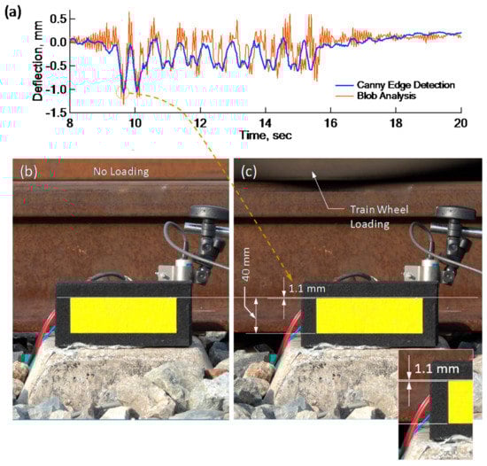As shown in Figure 8, together with the sensors for the PDM, two DSLR cameras (RX 10 Mark 3 by SONY, Tokyo, Japan) were installed 12.5 m from the railroad track to capture the movements of two yellow rectangular targets, one at the same sleeper and the other 25 m away from the railroad track in the array perpendicular to the track, as shown in Figure 8. To digitize the captured target images, a Canny edge detection technique [,], was employed. Later, the deflections digitized by Canny edge detection technique were compared with the results by Blob analysis [] for validation. Canny edge detection technique extracts edges by: (1) applying a Gaussian filter which smooths the image; (2) evaluating gradients to identify color change; and (3) adopting a threshold for the characterization of edges. Blob analysis analyzes pixels of images in the format of a blob, which is a rectangle with homogeneous area. In the Blob analysis, the images are first smoothed by a Gaussian filter, then treated by a color threshold to detect blobs in a rectangular area consisting of pixels with constant contrast.