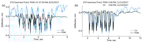 Deflections evaluated by PDM and computer vision technique: (a) measured at the same time; (b) measured at a different day for the same train.