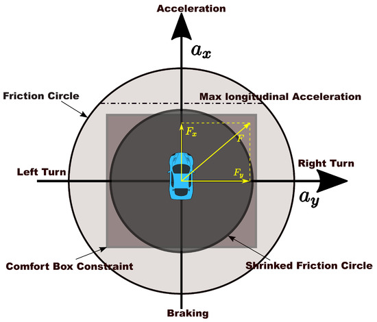 Gu et al. [8] developed a constraint-based speed planner that trimmed the reference speed profile according to maximum velocity, lateral acceleration, longitudinal acceleration and deceleration. Since smoothness of the speed profile is not taken into account, the excessive longitudinal jerk may be observed [9]. They considered moving obstacles in speed planning in a reactive way based on the distance between obstacles and the ego car to affect speed profiles in the following work [10] and further enforced jerk limits on the speed profile in [9] for the sake of smoothness. As dynamics constraints are considered separately in the form of comfort box constraints that its upper boundaries need to be selected conservatively to prevent the total force from exceeding the friction force limits, the capacity of driving on the limits to deal with emergencies or pursue time efficiency is highly restricted. The difference of potential solution space of comfort box constraints and friction circle constraints is shown in Figure 1. In addition, the reduction of friction coefficient in extreme weather conditions will shrink the friction circle and the original fixed comfort constraints may create one or several dangerous zones in solution space, as shown in Figure 1, which will inevitably cause potential safety issues.
