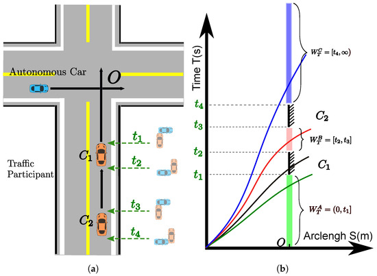 A cross scenario with moving vehicles. (a) A cross scenario without traffic lights. The blue car is the autonomous car. The orange cars (, ) are the oncoming vehicles with prescribed speed profiles. (b) A S-T graph that describes different types of time windows and possible solutions to avoid moving vehicles. The S is the arc-length along the path of the autonomous car.