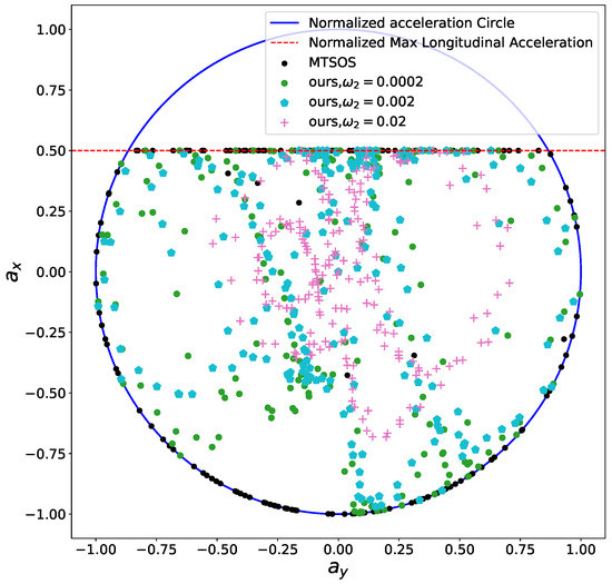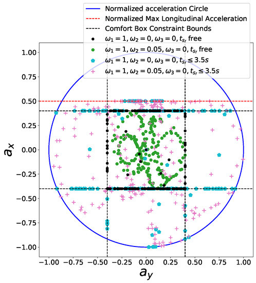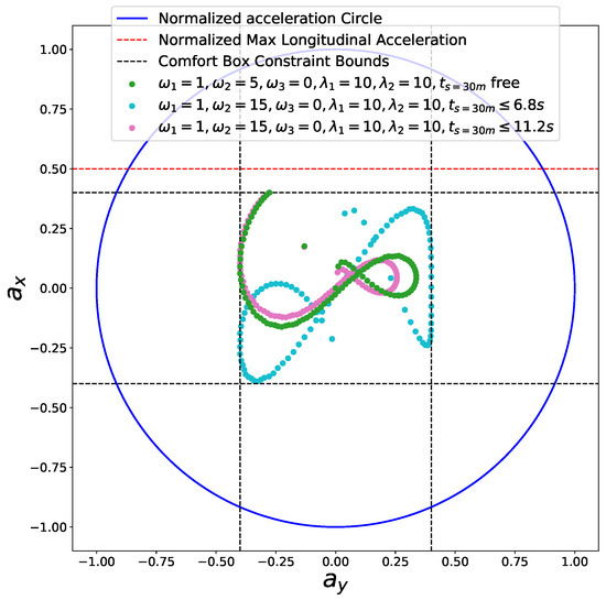The comfort acceleration thresholds and are listed in Table 3. For case A, we only took the time efficiency objective into account and enable the comfort box constraints. The light blue curve in Figure 12 shows the resulting speed profile and the black dots in Figure 13 depict the resulting acceleration points distribution. Due to the presence of the time efficiency objective and limits of semi-hard comfort box constraints, most of the acceleration points tend to stay on the edge of box to achieve minimum travel time under such constraints. For case B, we add the smoothness objective in based on case A. The resulting speed profile is shown as the green curve in Figure 12, which is smoother than previous one. The rationale behind this is that the smoothness term encourages gentle control efforts to keep smooth transitions between states. Thus the acceleration points of case B more focused around the center of the friction circle while still staying inside of the box, shown as green dots in Figure 13. To demonstrate the “semi-hard” feature of our formulation, we imposes a time window constraint by making the final arriving time s. With this constraint, the mobility constrained by the box region is no longer enough to achieve the required time efficiency. To get a solution that satisfies the time window constraint, the optimization has to exploit the region that is within the friction circle but outside of the box. The results of the acceleration points distribution of case 3 (see cyan pentagons in Figure 13) and case 4 (see pink pluses in Figure 13) proved our statements. The acceleration points were no longer limited within the box region. The corresponding speed curves were shown as the light red curve for case 3 and blue curve for case 4 in Figure 12. This nice feature distinguishes our method from existing speed planning methods such as [7,9,11] that regard comfort box constraints as hard ones like (21). Their methods guaranteed the ride comfort at the expense of losing potential mobility. Limiting accelerations to the comfort box region dramatically reduces the solution space of the speed planning problem, which may lead to no solution when one does exist in certain situation. Our method, instead, turns the comfort constraint to a semi-hard constraint by leveraging penalty functions and slack variables. More precisely, when the region limited by the box constraint is able to provide the needed mobility to satisfy other hard constraints, the slack variables are reduced to zero and the penalty functions have no effects on the optimization. The comfort box constraint is equivalent to a hard constraint. However, when the mobility provided by the box region is not enough to satisfy other hard constraints, slack variables increase and the penalty functions penalize the constraints violation. The comfort box constraint then is transferred to a soft constraint. By doing so, our method gives priority to the solution space in box region and leverages the outside region when necessary, which emphasizes comfort while keeping the solution space complete. To the best of our knowledge, none of the existing speed planning methods for autonomous driving has done this.