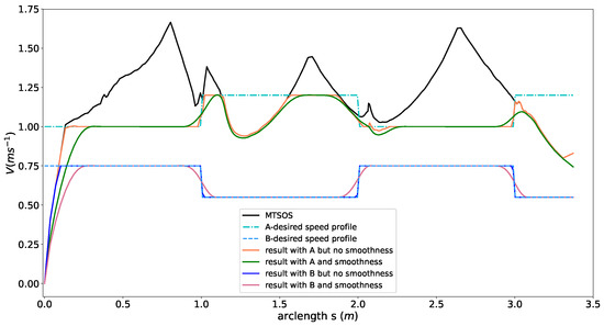 Direct tracking of a minimum-time speed profile will lead to joint vibrations and overshoot of the nominal torque or force limits of actuators [34,35]. When this happens in autonomous driving cars, it most likely results in bad ride experience and unstable driving behaviors. To ensure a smooth speed profile for better tracking performance, reducing wear of power train systems and guaranteeing the ride comfort at the same time, the smoothness of the trajectory needs to be considered. Since we assume a smooth and curvature-continuous path has been generated by a path planning module, we only consider the longitudinal jerk component of the trajectory. Formally speaking, jerk is the first derivative of acceleration in terms of time t, which also means the second derivative of velocity and the third derivative of position. According to (7) and (8), the jerk of the speed profile can be calculated as follows,