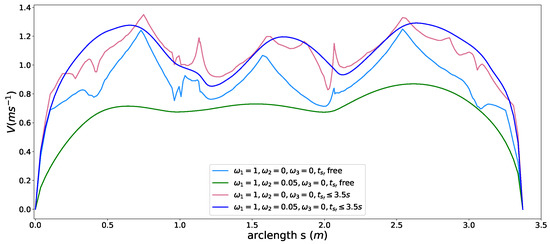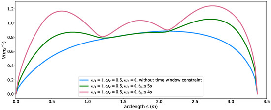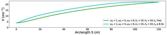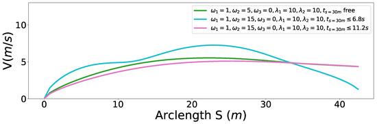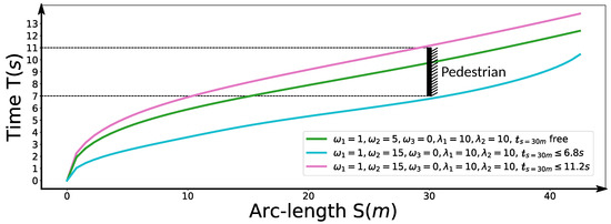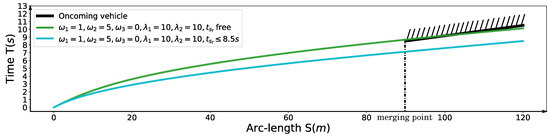 Different from the approach used in [11] that optimizes deviation between the planned speed and desired speed to ensuring time efficiency implicitly, we optimize the total traveling time along the fixed path from 0 to directly like [2,3], which can be expressed as . Substitute the time variable t with arclength s and we get