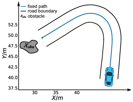 Due to the non-holonomic dynamics of the vehicle system, the lateral motion and longitudinal motion are intrinsically coupled in a way that the car cannot move laterally without longitudinal speeds. The lateral motion is explicitly expressed by the prescribed path. The longitudinal motion is the goal of this paper. To build the connection between them and describe the vehicle dynamics explicitly in the problem formulation, we employ the single track vehicle model [32] (see Figure 2) to represent the actual vehicle kinematics and dynamics, which is widely used in motion planning research [9,19,22,30] and performs satisfactorily in practice [33]. The control force is defined as , where is the lateral force and is the longitudinal force in ego frame. The dynamics of the car are given by