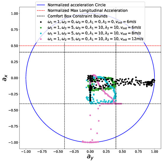 First, we considered a cornering scenario (see Figure 14) with different entry speeds. At the end of the road, a static obstacle blocks the road and the car must stop safely in front of the obstacle. The comfort box constraints parameters used in this experiment are listed in Table 5. First, we perform speed planning that considers the time efficiency, smoothness objectives, friction circle and final speed constraints by making . The initial speed of the car is = 6 m/s. The semi-hard comfort box constraints were not taken into consideration in this one. The corresponding results are shown in Figure 15 and Figure 16 in black color. The second experiment was carried out using the same parameters. In addition, the semi-hard comfort box constraints were added by setting and . The corresponding results are shown in green color. As depicted in Figure 15, when comfort box constraints were not presented, the optimization uses more control efforts when cornering and stopping for the sake of time efficiency. Once comfort box constraints were added, the control efforts were limited into the box region when mobility is enough to use. Next, we conducted the next two experiments using the same setting with that of the green one except two different initial speed = 8 m/s (cyan curves and dots) and = 12 m/s (pink curve and dots). As shown in Figure 15, when the initial speed increase to 8 m/s, the region constrained by comfort box was still able to provide enough mobility to stop at the end. Thus all the acceleration points stayed inside the box region. However, when the initial speed was increased dramatically to 12 m/s, the optimization had to use more control efforts to stop in the end. In consequence, the box constraints are “softened” and acceleration points went beyond the box region to guarantee a safe stop. With the comfort box constraint as a hard one, the method cannot get a solution in the last case.