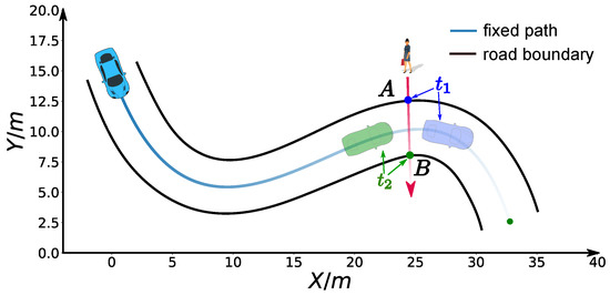 Second, we considered a jaywalking scenario on a curvy road. The time window = 7 s, = 11 s] that the pedestrian occupies the road at m is given by a dynamic obstacle prediction subsystem. As shown in the previous experiments, our method is able to stop at a specified point along the path. Here, we consider two advanced use cases to avoid the pedestrian safely without stop by manipulating the arrival time. Non-stop dynamic obstacle avoidance strategies may result in energy saving driving behavior or greatly reduced operation time in certain cases. As the pedestrian occupied the road between 7 s and 11 s at m along the path, if our car reaches m in the same time window, an accident may happen. Unfortunately, with the parameter setting , our car will collide with the pedestrian, which is shown as the green curve in Figure 17. Two strategies can be employed to avoid this failure. The first involves passing the potential collision point before the pedestrian arrives point A, that is, , which is shown as the blue car situation in Figure 18. The second involves passing the potential collision point just after the pedestrian passes point B, that is, , which is shown as a green car situation in Figure 18. We solved this problem using both strategies. By making s, we solved the former case and the corresponding results are demonstrated in color cyan in Figure 17, Figure 19 and Figure 20. In practice, we may be not able to pass the barrier in time using the former strategy due to dynamics constraints of cars. The latter approach or a safe stop at a specified point along the path can be always employed to avoid collision. The latter approach is solved by setting s. The results are presented in color pink in Figure 17, Figure 19 and Figure 20. It should be noted that the second approach is an indirect method for avoiding collision in this scenario. We first stretch the time by increasing the coefficient from 5 to 15, then compress the arrival time by making s. The exact arrival time at m for three different cases are s (green), s (cyan), and s (pink).