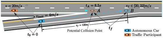 In dynamic environments, speed planning also makes a difference in terms of dynamic obstacle avoidance. Regulating speed along the fixed path to avoid dynamic obstacles rather than swerving the path to deal with the dynamic obstacles (such as pedestrians, cyclists who are crossing lanes, changing lanes or turning in the intersection) may be thought of as a smart, energy-saving, and risk-free behavior in certain situations. It also should be noted that not all the cases with dynamic obstacles can be overcome using this method. It works under the the assumption that the path has been well predefined using some sampling techniques. Given the prescribed path, overtaking a slow front car using an opposite lane [11] imposes one or several time window (TW) constraints for speed planning in time domain at the conflict region with other road participants along the path. Merging from a freeway entrance ramp to a lane with an oncoming high-speed vehicle on expressway [12,13] does not only bring in a time window constraint but also boundary conditions such as a desired final speed and acceleration constraints to keep the pace with other traffic participants. These cases require that the car reaches a certain point on the path in the time window to avoid collision. However, most of the existing methods [3,4,7,8,14] ignore these constraints, which make their methods applicable only in static environments.