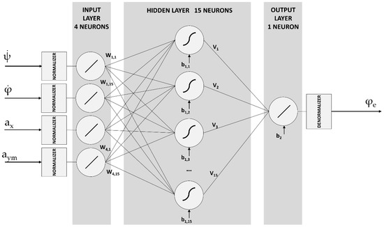 The vehicle Roll Angle Estimator component uses ANNs to estimate the vehicle roll angle. Most of the previous proposed estimators are based on model [1,2,3]. The main drawback of these algorithms is that they need detailed physical characteristics of the system in order to obtain an accurate model. To tackle this problem, Artificial Intelligence is now being used. The proposed ANN architecture used to estimate the vehicle roll angle was previously presented in [6]. The ANN consists of three layers as depicted in Figure 3: (1) an input layer; (2) a hidden layer and (3) an output layer. The number of neurons of the hidden layer is 15. The output of the ANN is the estimated vehicle roll angle, φe, which is obtained as: