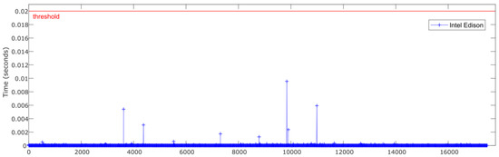 Figure 14 and Figure 15 show the relationship between the sensors measured data processing time (normalization + ANN estimation + denormalization) for both Intel Edison and Raspberry Pi 3 Model B, respectively, and the established threshold corresponding to the sampling rate (50 Hz).