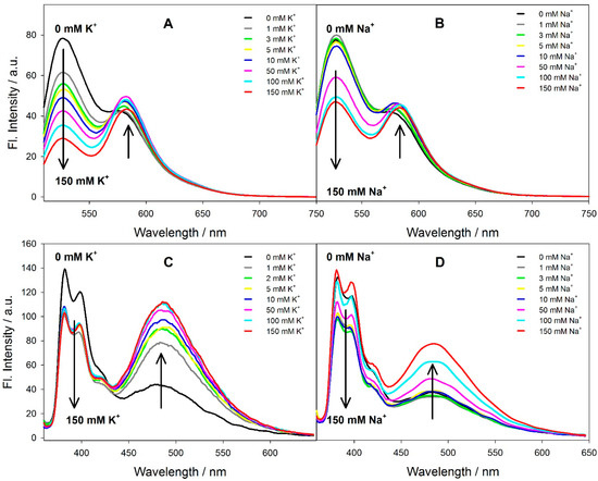 Potassium and sodium ions effect on the fluorescence spectra of 0.2 µM Ch(F-TBA-T) ((A,B), respectively) with λex = 490 nm, and Ch(py-TBA-py) ((C,D), respectively) with λex = 340 nm. Conditions: 10 mM TEA buffer (pH 7.5), KCl and NaCl concentration: 1, 3, 5, 10, 50, 100, 150 mM.