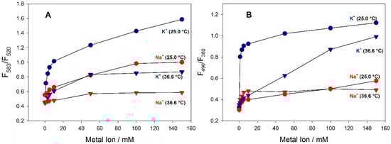 Fluorescence intensity ratio of Ch(F-TBA-T) (F583/F520) (A) and Ch(py-TBA-py) (F490/F380) (B) systems plotted against K+ or Na+ concentration at 25 °C and 36.6 °C.