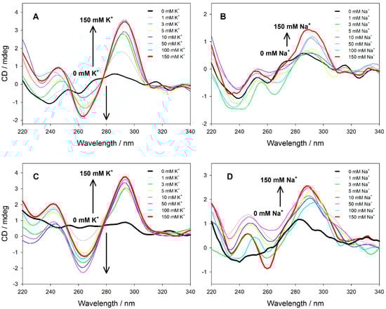 Effect of potassium and sodium ions on the CD spectra of 1 µM Ch(F-TBA-T) (A,B) and Ch(py-TBA-py) (C,D) probes. Conditions: 10 mM TEA buffer (pH 7.5), KCl and NaCl concentration: 1, 3, 5, 10, 50, 100, 150 mM.