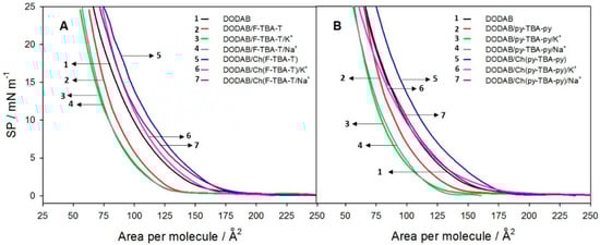 Figure 4 shows π-A isotherms of the DODAB monolayer recorded on the subphase containing 8.3 nM F-TBA-T or Ch(F-TBA-T) probes (Figure 4A) and py-TBA-py or Ch(py-TBA-py) probes (Figure 4B) in the absence and in the presence of potassium or sodium ions. The isotherms recorded on the F-TBA-T- or py-TBA-py–containing subphases (line 2, Figure 4A,B) are shifted into the lower surface area per molecule, when compared with the reference isotherms recorded on the subphase containing only 10 mM TA buffer (line 1, Figure 4A,B) that indicates adsorption of DNA strands on the subphase/monolayer interface. Addition of metal cations (K+ and Na+) that are known to promote G-quadruplex formation further affected π -A isotherms, in agreement with results reported previously for similar systems [46,47]. The addition of metal cations (potassium, line 3 and sodium, line 4; Figure 4A,B) further affected π -A isotherms by inducing G-quadruplex folding that resulted in a more compact monolayer formation, also in agreement with results reported previously for similar systems [46,47]. In contrast, isotherms recorded for DODAB monolayers in the presence of cholesterol-type probes (Ch(F-TBA-T) and Ch(py-TBA-py)) in the subphase (line 5, Figure 4A,B) are shifted into the higher surface area per molecule in relation to the DODAB isotherm (line 1, Figure 4A,B). In this case, besides electrostatic interaction between the positively charged DODAB monolayer and the negatively charged DNA phosphates, the hydrophobic insertion of cholesterol moieties into the monolayer should be considered. The later process adds additional surface area to the DODAB film that is related to the cross-section of cholesterol moiety. The addition of potassium ions (line 6, Figure 4A,B) and sodium ions (line 7, Figure 4A,B) for cholesterol-anchors probes, induced G-quadruplex folding that resulted, similar to the probe without cholesterol (F-TBA-T, py-TBA-py), in a more compact monolayer formation compared to the monolayer for the probe in the absence of metal ions (line 5, Figure 4A,B).