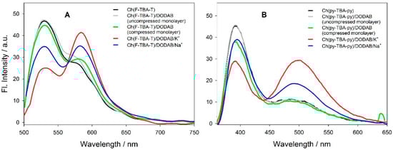 Emission spectra for Ch(F-TBA-T) (A) and Ch(py-TBA-py) (B) probes at monolayer DODAB interface: probe in subphase (black line), after DODAB monolayer spreading (grey line); after monolayer compression to 20 mN/m (green line); after K+ addition (red line); and, after Na+ addition (blue line). Conditions: subphase contained 10 mM TA buffer (pH = 7.5) and 40.0 nM probe; 100 mM KCl or NaCl.