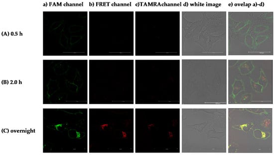 Confocal microscopy analysis of HeLa cells treated with 50 nM Ch(F-TBA-T) for 0.5 h (A), 2 h (B) and overnight (C). Fluorescence emission filters: (1) for FAM channel (green), 510–540 nm, excitation wavelength: 480 nm; (2) for TAMRA channel (red), 595–630 nm, excitation wavelength: 560 nm; and, (3) for FRET channel, 595–630 nm, excitation wavelength: 480 nm. Scale bars: 50 μm.