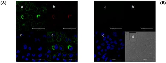 Confocal microscopy analysis of HeLa cells treated with 200 nM Ch(F-TBA-T) (panel (A)) and untreated (negative control in panel (B)): (a) FAM channel (green); (b) FRET channel; (c) Hoechst 33342 fluorescence form stained nuclei (blue); as well as (d) bright field image of control and (e) overlay of all images a–c of Ch(F-TBA-T). The experiment details: The probe was added at 200 nM concentration to medium. After leaving overnight, Hoechest 33342 was applied to cell culture at a final concentration of 5 µg/mL and images was were taken after 15 min. of staining. Before fluorescence imaging, experiment cells were washed twice with PBS and placed in FluoroBright Live Cell Fluorescence Imaging Medium. Fluorescence emission filters: (1) for FAM channel, 510–540 nm, excitation wavelength: 480 nm; (2) for Hoechst channel, 480–500 nm, excitation wavelength: 405 nm;and (3), for FRET channel, 595–630 nm, excitation wavelength: 480 nm. Scale bars: 50 μm.