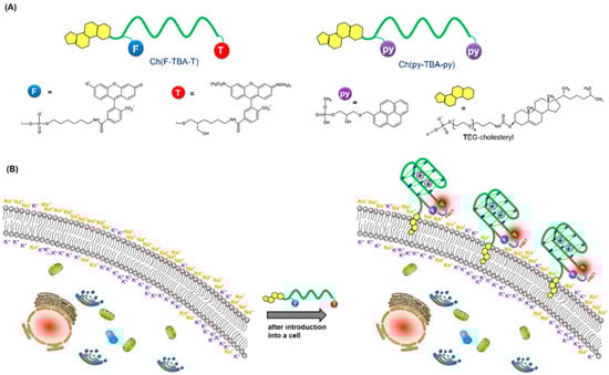 The model cholesterol-anchored fluorescent oligonucleotide probes for potassium sensing at the cell membrane interface are illustrated in Scheme 1. The amphiphilic lipid−DNA probe consists of a hydrophobic cholesterol moiety, hydrophilic DNA strand, and fluorophores attached to DNA (Scheme 1A). The Ch(F-TBA-T) probe was modified with FAM and TAMRA, whereas the Ch(py-TBA-py) probe was modified with pyrene groups, at the 5′- and 3′-termini of the oligonucleotide, respectively. Due to the phospholipid bilayer structure of the cell membrane, lipid−DNA probes can be directly anchored on the membrane through the hydrophobic interaction between the cholesterol moiety and the phospholipid. Thus, anchoring DNA makes use of the naturally occurring membrane constituent, consequently eliminating the risk of side effects induced by chemically reactive lipid headgroups incorporated in membrane constituents [25].