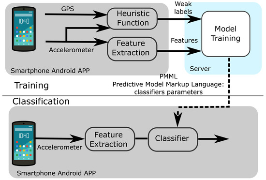 The smartphone app collects raw data samples from the on-board accelerometer and the GPS. The GPS is combined with the step count to generate weak labels using the heuristic function. Extracted features are sent to the server along with the labels in order to train the model. Parameters of the classifier are sent back to the app in Predictive Model Markup Language (PMML) format. Finally, the classification can be performed locally on the smartphone instantiating the appropriate classifier based on the parameters.