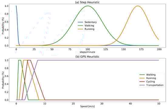 The probability assigned to a weak label is calculated by merging probability functions corresponding to the target activities, modeled as membership functions of a fuzzy set. Fuzzification of values provides a convenient way to map values (steps/minute rate and estimated speed) into a probability model. The set of target activities is modeled into two fuzzy sets: one for the step rate and one for the GPS as depicted in Figure 2. The set of membership functions for the step count is modeled using Gaussian distributions (with mean and standard deviation centered in the normal walking and running rate). The choice of modeling step count probability functions using a Gaussian distribution is based on the fact that walking and running rates are assumed to be normally distributed in the population. The spm rates for walking and running intervals are taken from [39,41]. The set of membership functions for the GPS estimated speed is built using trapezoidal functions shaped considering estimated speed. The choice of trapezoidal functions is based on the fact that the assumption of estimated speed being normally distributed cannot be made in this case, since speed is affected by multiple factors (e.g., vehicles in use and traffic conditions).