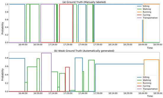 In ref. [14], we directly assigned labels merging the step count and GPS information. In this enhanced version of the heuristic, a probability estimation is introduced aiming to assess the quality of produced weak labels using a probability model.