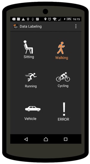 As in our previous experiment, the dataset has been manually labeled using a mobile app. The app has been installed on the user’s personal smartphone. The user has been told to carry the smartphone as he would normally do. The app starts collecting data from GPS and the accelerometer in the background after first launch, with no further interaction needed for data collection purposes. The user was asked to use the app to annotate activities while performing his normal routine, allowing to have a manually labeled groundtruth to assess both the accuracy of the automatic labeling, and the final detection accuracy of a trained classifier. The user interface of the app has been designed to be intuitive, and no further training was required. The annotation process is done in real time while activities are being performed. The annotation is performed in the following way. The user selects the start of an activity clicking a label, and this activates the selected label on the interface. Labels are considered as mutually exclusive; therefore, the start of an activity would result in closing the one previously activated (if present). As depicted in Figure 4, the interface provides icon buttons for target activities and an error button to notify the presence of an error in the labeling (e.g., user forgetting to activate the new activity in the transition). The error label is a special label in the dataset. This method allows the algorithm to ignore the last label preceding the error notification when generating the final ground truth. Moreover, to reduce the local uncertainty of the labeling process, a window of 4 s (2 before and 2 after the manually labeled transition) has been ignored between two consecutive activities.