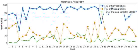 Accuracy of heuristic function over the 38 days composing the dataset. Label precision has been calculated as the number of correct labels divided by the total number of weak labels. Percentage of missing labels has been calculated as the number of missing labels divided by the number of total labels manually annotated.
