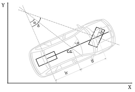 As usual in most vehicle control studies, the justifications for using a linearized model are based on the small-angle approximations ( and ) in the force and momentum balances in the dynamic model and are also justified by the linear approximation of ground adherence forces, given by the cornering coefficients and .