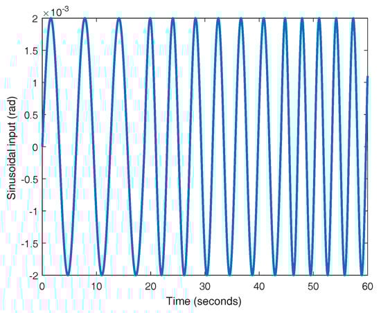 In order to get the value for the cornering stiffness coefficient, a well-posed experiment for the identification must be employed. In this case, an open-loop experiment is used. For this plant, the input is the steering angle of both front wheels () and the output corresponds to the lateral position of the center of gravity of the vehicle. To increase the accuracy of the identification, a chirp input signal with a low amplitude is selected (see Figure 3). The test is divided in three time intervals where the frequency of the input signal is different for each interval. Thus, the frequency is used for the time interval , being rad/s and s. The amplitude of the signal is in the range of radians to guarantee small angles of .