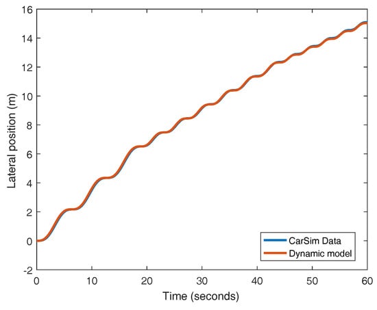 This model can be particularized for this case study, with a particular longitudinal speed () and the characteristic dimensions of the vehicle, as it can be seen in Table 1. The cornering stiffness coefficient was identified with CarSim. As introduced in Section 1, CarSim is a software considered to be a standard in the automotive industry, used by several manufacturers during the design stage of their vehicles for validation purposes.
