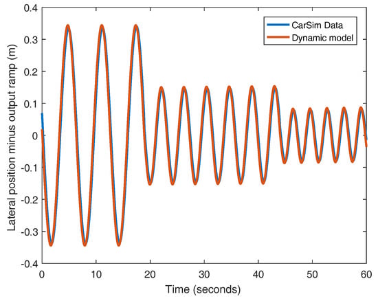 In this work, the identification of the cornering stiffness coefficients ( and ) is performed assuming that both coefficients are equivalent, the tires are equal and the traveling speed is kept constant at 25 m/s. In these conditions, the value of the cornering stiffness obtained is 103,340 N/rad. The responses of both the identified plant and CarSim are very similar, as it can be seen in Figure 4. If the output of the plant is processed and the ramp of the response is removed, the variation of the output signal around zero is obtained (see Figure 5). The difference between the model and CarSim data exhibits a low error for this experiment as depicted in Figure 6.