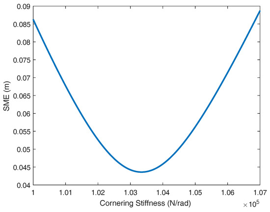 Square mean error between the dynamic model and CarSim data versus cornering stiffness.